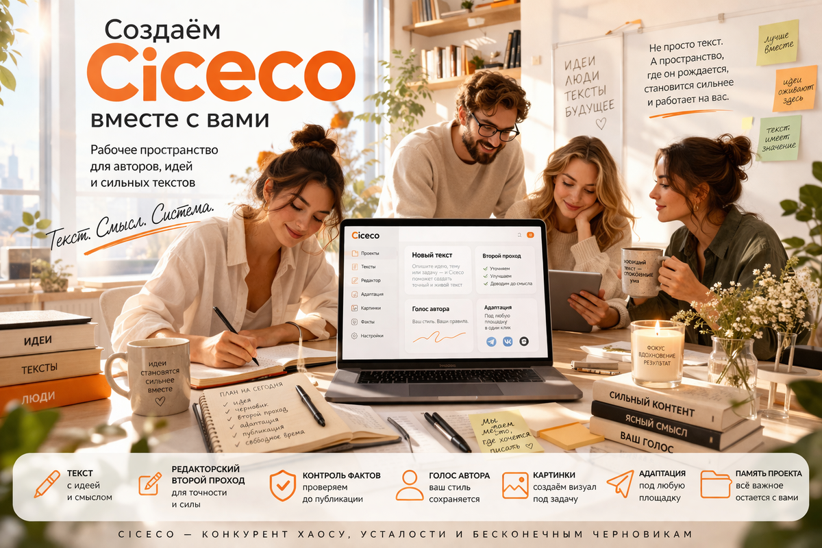 Мы развиваем Ciceco — наш кабинет для авторов текстов. И за это время вокруг нас собрались люди, которых невозможно не заметить. Творческие, думающие, очень разные по профессиям и задачам — но объединённые одним редким качеством: они работают с текстом. И чем глубже мы в это погружаемся, тем яснее становится, насколько разным может быть текст: Когда мы начали разговаривать с авторами, запрашивать обратную связь, приглашать их посмотреть на Ciceco не как на готовый продукт, а как на пространство в процессе — стало понятно: мы нащупали что-то большее, чем просто инструмент. Вокруг Ciceco начинает складываться сообщество. Живое, внимательное, очень тёплое. Появлялись люди, с которыми хочется говорить, обсуждать, спорить, думать вместе. Это даёт ощущение опоры. Сейчас в Ciceco многое обсуждается. Мы спрашиваем авторов, каким должен быть ваш кабинет: камерным или функциональным, редакторским или технологичным. Что действительно нужно в работе, а что, наоборот, мешает. Какие функции стоит до