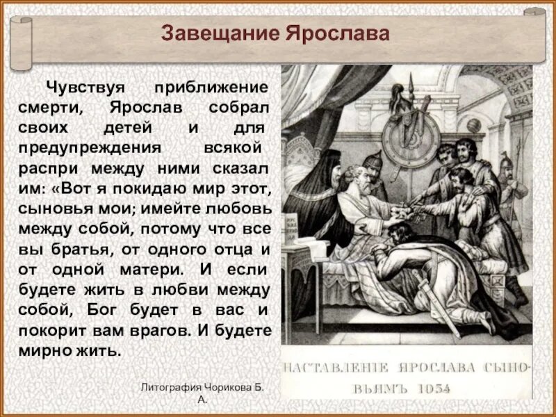 Внесенное летописцем в Повесть временных лет так называемое предсмертное наставление Ярослава своим сынам, является поздней выдумкой. В летопись оно вносилось через много лет после кончины Ярослава Мудрого.