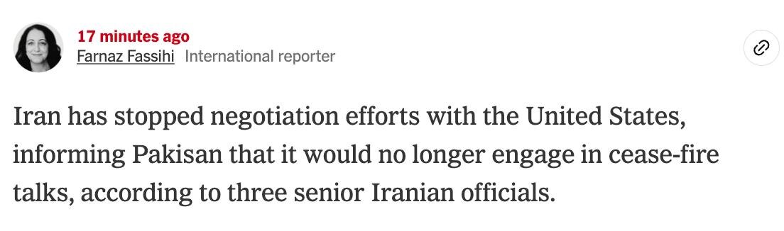 ❌🇮🇷 NYT: Иран объявил о выходе из переговоров о прекращении огня с США, заявив Пакистану о своем отказе от дальнейшего участия.