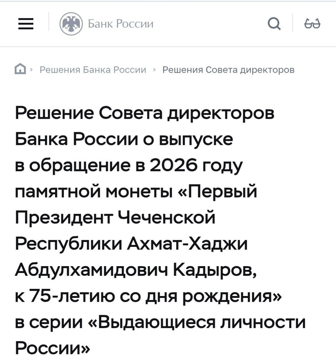 В 2026 году Банк России выпустит памятную монету в серии Выдающиеся личности России к дню рождения Ахмата Кадырова. Для широкой аудитории это символический жест. Для коллекционеров и инвесторов — потенциальный рост спроса на редкие тиражи и оживление рынка нумизматики. 🪙 Государственная символика как экономический сигнал Памятные монеты Центрального банка — это инструмент культурной политики и одновременно элемент финансового рынка. Ограниченный тираж формирует дефицит, а статус эмитента гарантирует подлинность и ликвидность. По данным профильных аукционов, редкие выпуски ЦБ за последние 10 лет показывали рост стоимости на 20–70% в зависимости от металла и сохранности. Включение современного политического деятеля в серию усиливает общественный интерес. До этого подобной чести среди современных политиков удостаивался Виктор Черномырдин. Ограниченность таких кейсов повышает коллекционную ценность выпуска. Спрос, тираж и вторичный рынок На цену влияют три фактора: материал монеты, о