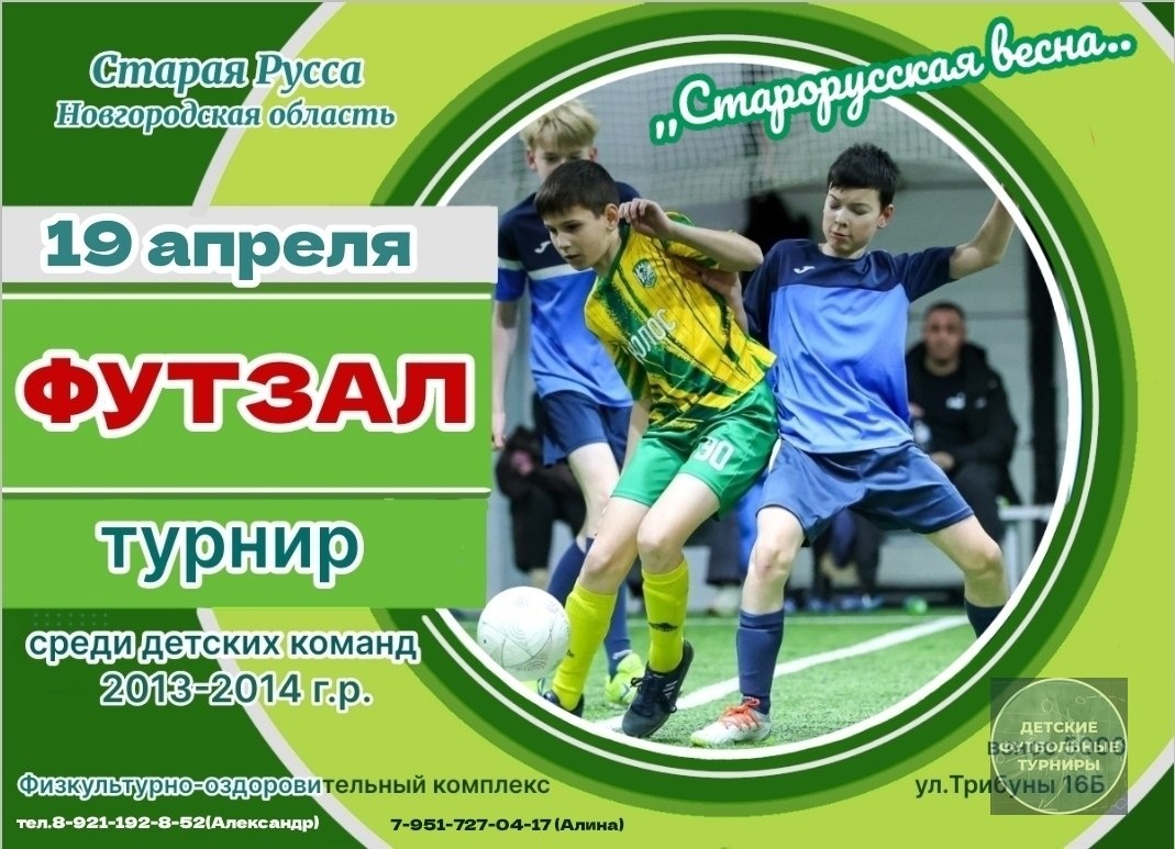 р. «Старорусская весна» Старая Русса (Новгородская область) 19 апреля Физкультурно-оздоровительный комплекс ул. Трибуны, 165 взнос 5000 тел. 8-921-192-8-52 (Александр) 7-951-727-04-17 (Алина) -— #ФутбольныйТурнирАпрель2026 #ФутбольныйТурнирСевероЗапад2026 #ФутбольныйТурнирНовгородскаяОбласть2026 #ФутбольныйТурнирСтараяРусса2026 #ФутбольныйТурнирНовгородскаяОбласть2013гр #ФутбольныйТурнирНовгородскаяОбласть2014гр Источник: https://vk.com/wall-157062695_1512