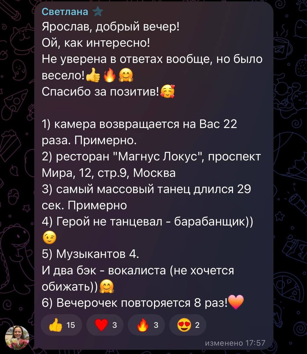 ⚡️ Этот комментарий был наиболее близок к правде! Правильные ответы: 1 – 29-31 раз; 2 – Москва, Проспект Мира 12c9; 3 – 29-30 сек; 4 – таких героев нет; 5 – 6 (или 4, если без бэк-вокала – оба варианта верны); 6 – 8 раз. Поздравляю победителя! С вами свяжутся представители моей команды.