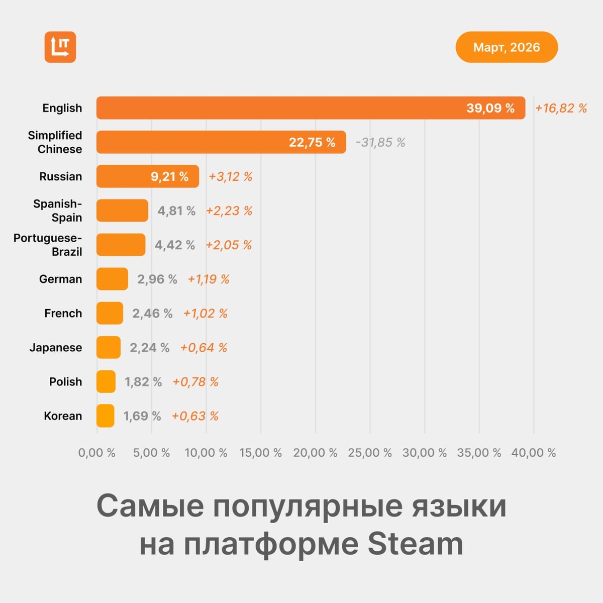 ✏️ Мы подготовили свежую статистику самых популярных языков на платформе Steam на основе данных за март 2026 года.
