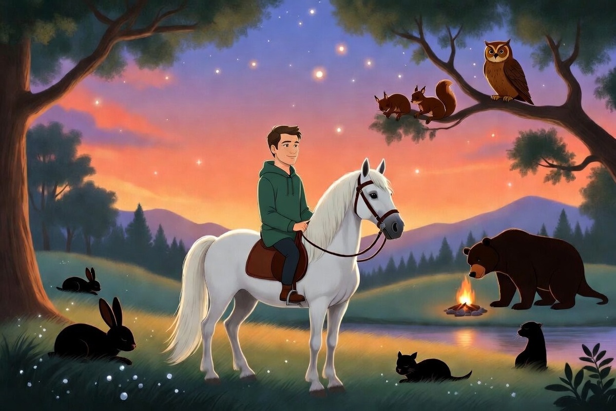 Принца звали Лунослав. Каждый вечер он садился на белого коня. Конь был спокойный и широкий, как диван. Его звали Топ потому, что он всегда шёл тихо, но слышно. Топ-топ-топ. Топ-топ-топ. Принц объезжал всё королевство. От края до края. От леса до реки. От реки до горы. И желал каждому спокойной ночи. Без этого утро не наступало. Так было заведено давно. Ещё до Лунослава. - Почему? - спросил он однажды у совы. Сову звали Уф. Она была старая и серая, и одно ухо у неё торчало выше другого. - Потому что кто-то должен, - сказала Уф. - Но почему именно я? - Потому что ты принц, - сказала Уф. - Принц это тот, кто делает то, что должен. Даже когда не хочется. Лунослав подумал. - А если я устану? - Устанешь, потом отдохнёшь, - сказала Уф. - Сначала надо объехать. Лунослав выехал на закате. Небо было оранжевым. Потом стало розовым и фиолетовым. Топ шёл мягко. Трава под копытами была мокрая от росы. Первой на пути была поляна зайцев. Их было много серых, белых, пятнистых. Они сидели и жевали что-