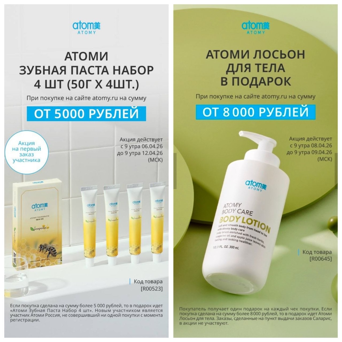 🎁 Зубные пасты + лосьон. Всё это — для новичков, кто ещё ни разу не делал заказ. ✅ При заказе от 5 000 ₽ — 1 подарок ✅ При заказе от 8 000 ₽ — 2 подарка сразу Это отличная возможность попробовать нашу продукцию и получить ещё больше. 👉 Если вы новичок — напишите мне «ПОДАРОК». Я помогу оформить и добавлю обе акции. #Atomy #подарки #новичкам #акция #попробуйкачество