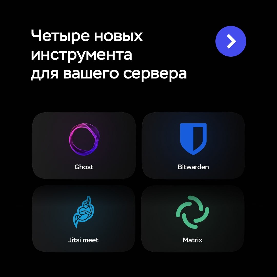 Добавили в маркетплейс новый набор инструментов для облачных серверов: 1️⃣ Bitwarden — менеджер паролей С этим сервсом все пароли будут храниться в одном месте. Подходит для тех, кто хочет усилить безопасность данных и не искать пароли по заметкам и чатам. 2️⃣ Ghost — платформа для медиа С удобным редактором, где можно писать текст, добавлять картинки, оформить пост — и сразу публиковать. Хорошее решение для корпоративных медиа и статей. 3️⃣ Jitsi Meet — сервис видеозвонков Когда нужно созвониться по видео без подписок и лимитов. Удобно для команд, обучения и внутренних созвонов. 4️⃣ Matrix — корпоративный мессенджер Для команд, которым нужен свой мессенджер с упором на приватность и контроль. Подходит для конфиденциальных данных. Забрать сборку → в маркетплейсе А сейчас у вас есть отличная возможность поделиться идеями для следующих сборок в комментариях, возьмем на заметку ✍️