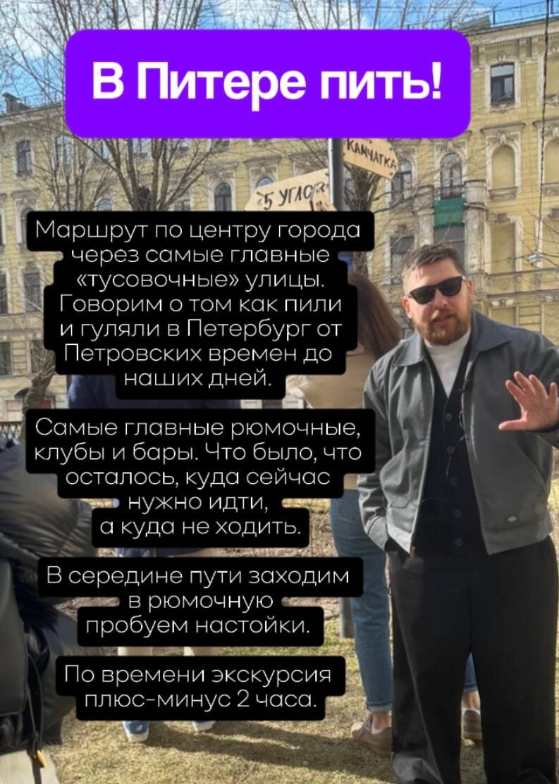 11 апреля, суббота. 15:00 В Питере пить 12 апреля, воскресенье 14:00 Петроградка Аннотации к экскурсиям на картинках. Стоимость: 3 тысячи с человека, если идете на обе - скидка. Будет классно, приходите. Бронь в личку.