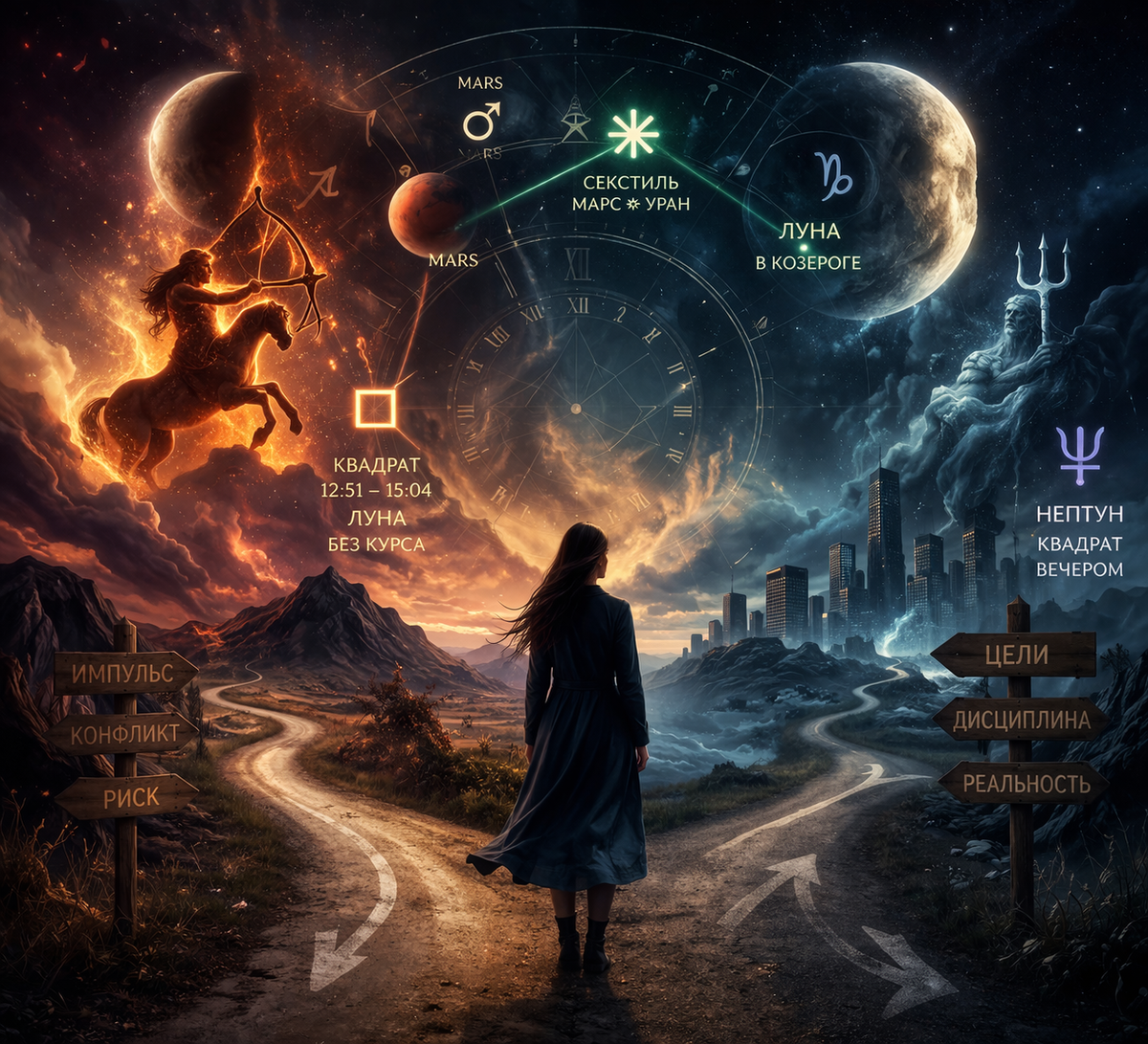 Луна продолжает движение по огненному и устремлённому в будущее Стрельцу, усиливая тягу к расширению горизонтов, поиску смысла и новых ориентиров. В первой половине дня квадрат к Марсу добавляет импульсивности, раздражительности и склонности к резким реакциям. Повышается конфликтность, особенно в вопросах принципов, убеждений и личных границ. Будьте аккуратнее в своих действиях и решениях. С 12:51 до 15:04 Луна без курса - время поставить важные дела на паузу. Для завершения дел, отдыха или рутинных задач - прекрасно. С 15:04 Луна в Козероге смещает фокус с идей и вдохновения на практичность, дисциплину и конкретные действия. Эмоции становятся более сдержанными, фон холодноватым и требовательным. На первый план выходят вопросы системности, правил, соблюдения тайминга, ответственности, разумности и целесообразности. При этом Луна под обстрелом Нептуна, и не всем получится добиться желаемой прозрачности, аккуратности и точности в делах. Риск путаницы, оши