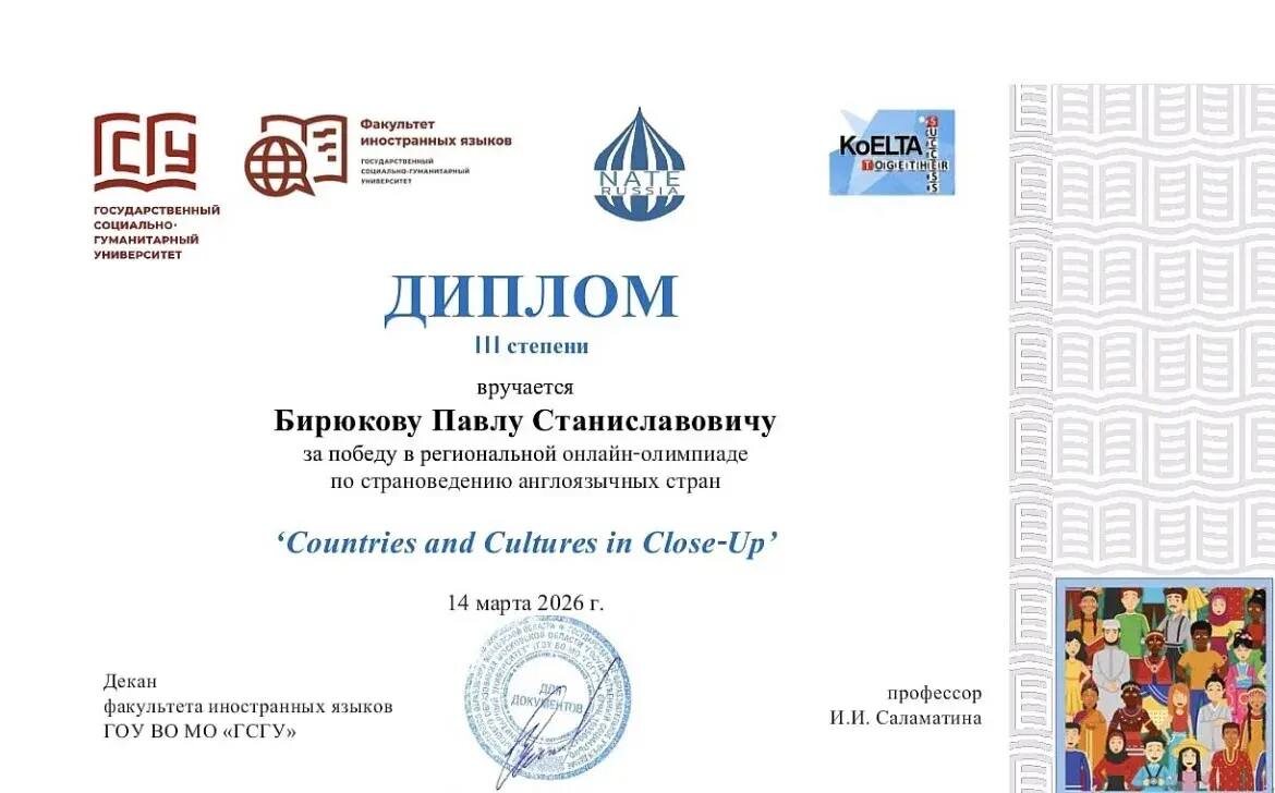 ! Кафедра лингвистики и межкультурной коммуникации факультета иностранных языков ГОУ ВО МО «ГСГУ» провела ежегодную региональную онлайн-олимпиаду по страноведению англоязычных стран «Countries And Cultures In Close-Up» для школьников и студентов Московской области, в которой приняли участие 699 учащихся из г. Москвы и Московской области. Студенты ГБПОУ МО «Колледж «Коломна», участники онлайн-олимпиады, показали хорошие результаты: Кошкин Г. – 3 место (наставник Сазонова С.В.) Бирюков П. - 3место (наставник Сазонова С.В.) Орловский Д., Русаков В.-участие (наставник Штейнгауэр Ю.И.) Савченко А., Макеева А, Митрофанова С. -участие (наставник Селюков Н.С.) #СПОмедиа #КолледжКоломна