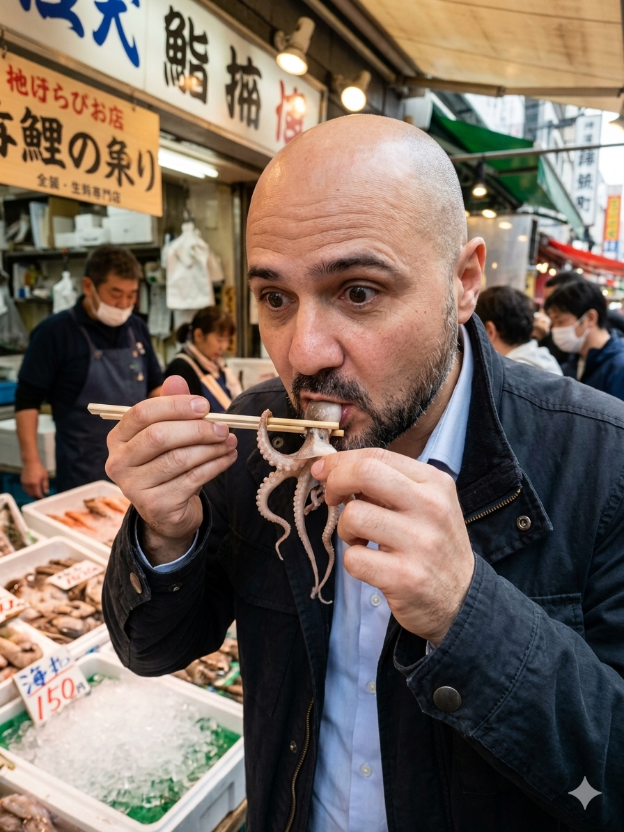 Токио, рынок Цукидзи, семь утра. Мой друг Дмитрий стоял перед лотком с щупальцами, которые шевелились в миске, и делал вид что изучает их с научным интересом. Он уже отказался от сашими. От сырой рыбы. Граница его мира заканчивалась там, где заканчивалась термическая обработка. Живой осьминог был уже за горизонтом его вселенной.