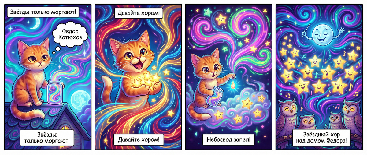 Ночью Федору стало скучно: звёзды только моргали, а не пели. Он забрался на самую высокую крышу, взял свою любимую банку и начал собирать туда самые яркие звёздочки. «Давайте хором!» — мяукнул он. Сначала звёзды стеснялись, но любопытство Федора оказалось заразительным. Он добавил в банку капельку своего мурлыканья, и вот уже весь небосвод запел тихую колыбельную про рыжих котят и далёкие