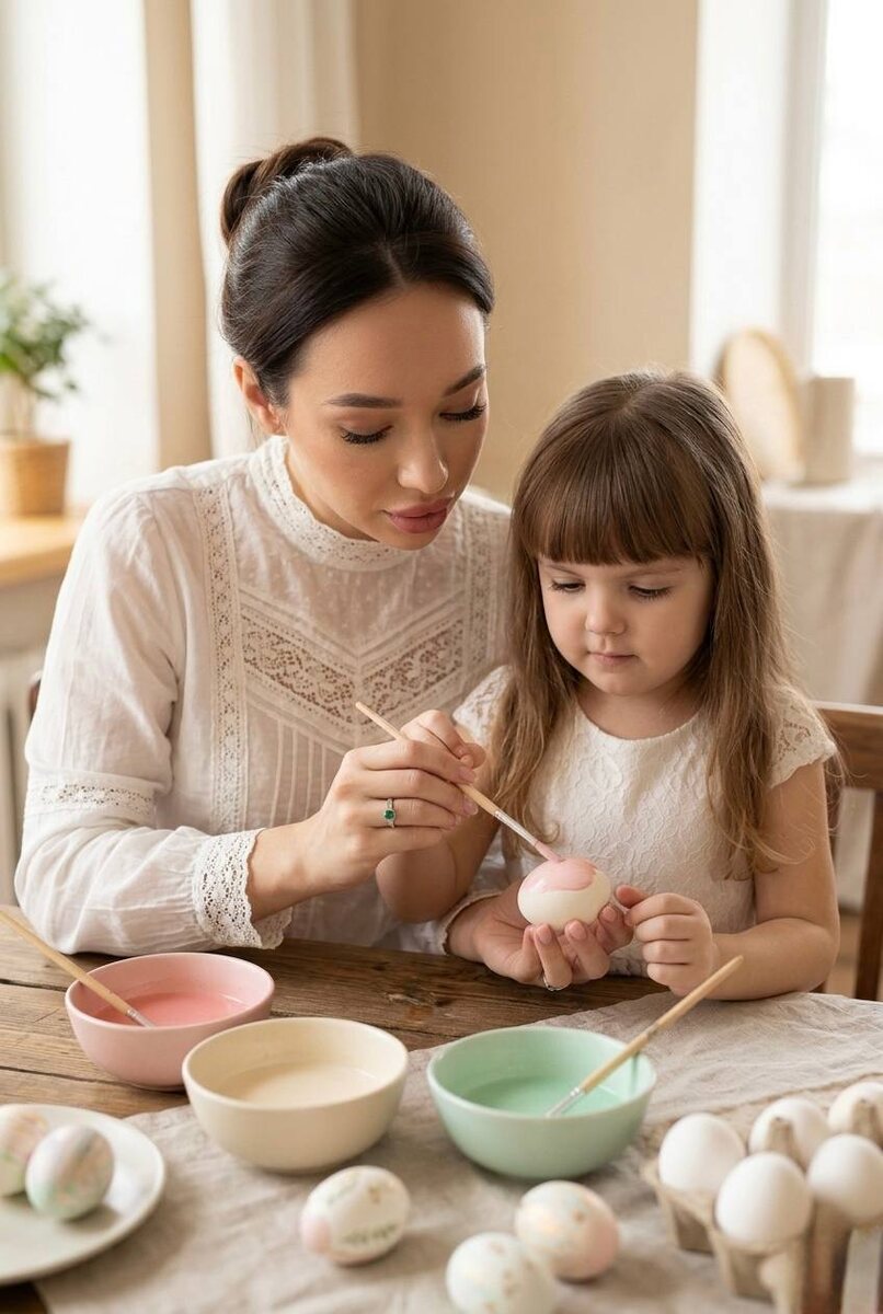 От подписчицы @sh0083 Использовать фото как референс лица (high likeness, natural skin texture, detailed face). Сцена: уютный светлый интерьер, домашняя атмосфера, процесс окрашивания пасхальных яиц за столом Образ: мама и маленькая девочка в светлой одежде с кружевными деталями, нежный семейный стиль Композиция: вертикальный кадр, крупный план, мама и ребенок рядом, акцент на руки и процесс окрашивания яиц Прическа: аккуратно собранные волосы, натуральный вид Свет: мягкий естественный свет, светлая и теплая атмосфера Цветокор: пастельный, бежево-кремовые оттенки, мягкий контраст Стиль: lifestyle, family, cozy, soft aesthetic Качество: ultra realistic, high detail, soft light, natural tones, clean look visible pores, natural skin texture, micro-details natural lip lines, soft color variation natural eyes, subtle reflections individual hair strands, soft natural texture most-AI.com - 80+ популярных нейросетей в одном приложении без VPN. Лучшие цены! 75% кэшбэка на бонусный б