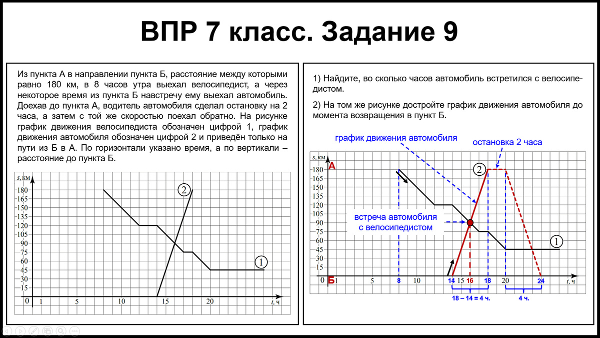 В этой статье разбираем задание 9 ВПР по математике для 7 класса — графики движения велосипедиста и автомобиля. Вы узнаете, как по графику найти время встречи и как достроить график движения автомобиля после остановки. Условие Из пункта А в направлении пункта Б, расстояние между которыми равно 180 км, в 8 часов утра выехал велосипедист, а через некоторое время из пункта Б навстречу ему выехал автомобиль. Доехав до пункта А, водитель автомобиля сделал остановку на 2 часа, а затем с той же скоростью поехал обратно. На рисунке график движения велосипедиста обозначен цифрой 1, график движения автомобиля обозначен цифрой 2 и приведён только на пути из Б в А. По горизонтали указано время, а по вертикали – расстояние до пункта Б. Найдите: Теория (что нужно знать перед решением) Алгоритм решения (пошагово) Задание 1. Находим время встречи Задание 2. Достраиваем график автомобиля Итог Таким образом, при решении задания 9 ВПР по математике для 7 класса на графиках движения мы получили: встреча в