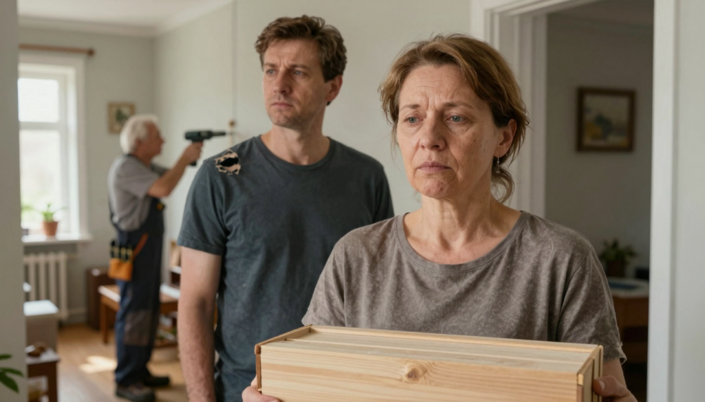 В одиннадцать он пришёл. Снял ботинки у порога, принёс с собой пахучий ветер подъезда. Я показала коробку – он распаковал её аккуратно, как хирург. Полка оказалась красивая: тёмный дуб, латунные кронштейны.