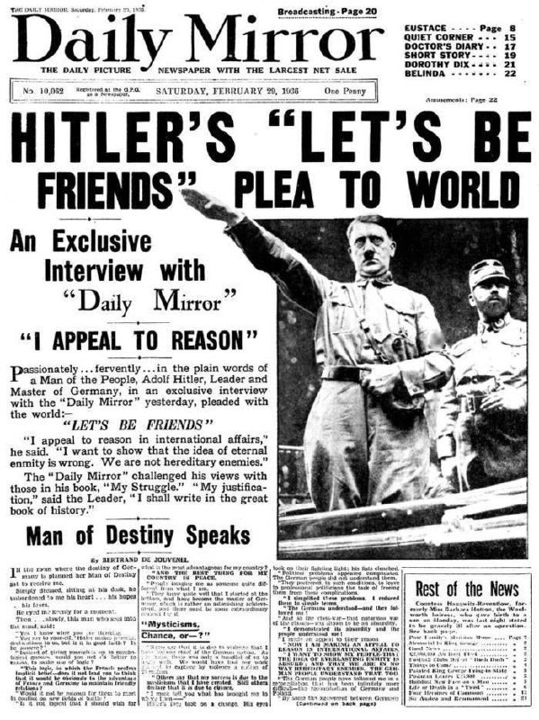 ! 🤝 Это не просто призыв, а настоящая инициатива! Вспомним, как в 1936 году Адольф Гитлер решил обратиться к мировому сообществу. Представьте себе, что он, возможно, думал, что дружба — это ключ к миру. Передовица Daily Mirror от 29 февраля 1936 года стала настоящим историческим документом, который показывает, как даже самые неожиданные личности могут пытаться наладить связи. Конечно, в его случае это было больше похоже на попытку завоевать доверие, чем на искреннее желание дружить. Но кто знает, может, если бы он действительно хотел дружбы, история пошла бы по другому пути? 😄