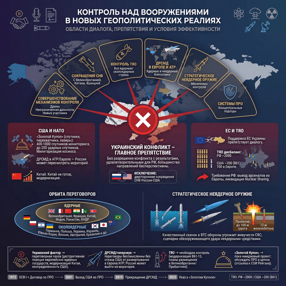 Диалог РФ с США и другими ядерными/неядерными державами по контролю над вооружениями и нераспространению должен вестись по направлениям: совершенствование механизмов контроля (включая беспилотные системы), дальнейшее сокращение СНВ с участием Великобритании, Китая и Франции, контроль над тактическим ядерным оружием, ограничение развёртывания ракет средней и меньшей дальности (РСМД) в Европе и АТР, контроль над стратегическими неядерными вооружениями и системами ПРО. Однако без разрешения украинского конфликта на приемлемых для РФ условиях большинство этих вопросов бесперспективно. Исключение — двустороннее сокращение СНВ (при взаимопонимании с США). Диалог с ЕС также бессмысленен, пока там не пересмотрят отношение к роли России в европейской безопасности. Ключевое препятствие — планы США создать глобальную ПРО «Золотой купол» (от 400 до 1000 спутников мониторинга, около 200 ударных спутников с лазерами и кинетическими перехватчиками, интеграция с существующими системами). Это нарушае
