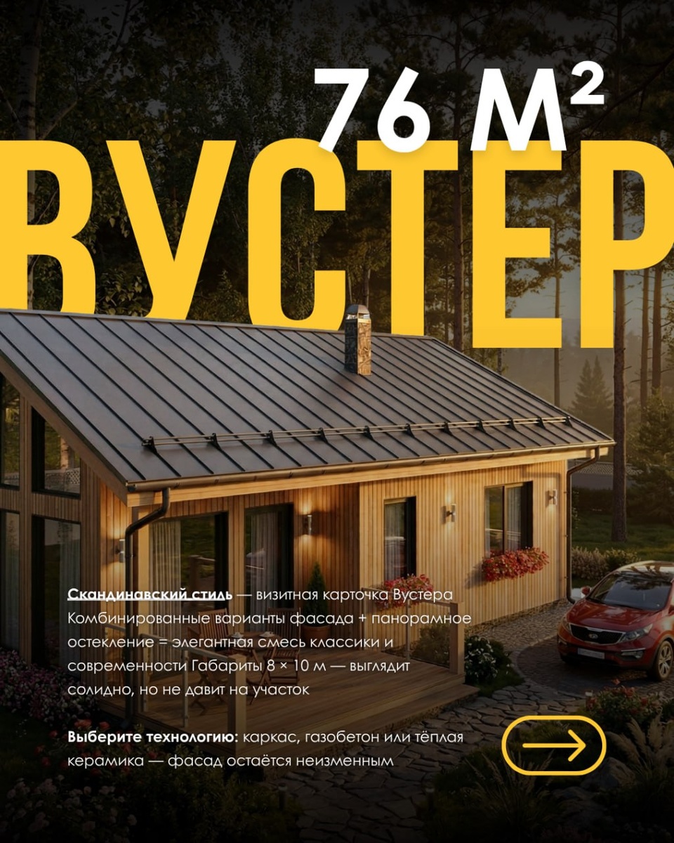 »! ✨ Если вы искали дом, в котором современная архитектура встречается с домашним уютом, то это он. Проект «Вустер» — это одноэтажный каркасный дом в скандинавском стиле, который идеально впишется в любой ландшафт. Чем он покоряет? ☀️ Панорамное остекление: В гостиной всегда будет много естественного света, а граница между домом и природой практически исчезнет. ☕️ Просторная терраса (12 м²): Идеальное место для утреннего кофе или вечерних посиделок с семьей. 🌲 Эстетика барнхауса: Лаконичные формы, отделка деревом и фальцевая кровля — тренд, который не выйдет из моды. Внутри всё продумано до мелочей: — Общая площадь: ~76 м² — Большая кухня-гостиная (24,4 м²) для теплых встреч. — Две уютные спальни по 12,6 м². — Компактный, но функциональный холл и санузел. — Ну и конечно потрясающая терраса 12 м². Хотите дом, который выглядит стильно, живётся уютно и стоит разумных денег? 💱Рассчитайте свою цену за 3 минуты в калькуляторе. 📞Напишите/позвоните нам прямо сейчас — поможем подобрать