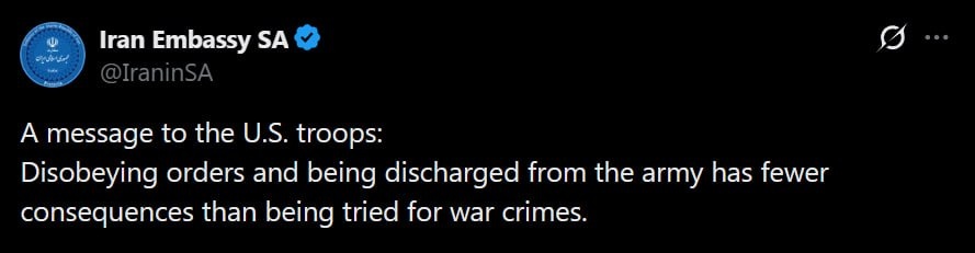 IRAN'S EMBASSY IN SOUTH AFRICA WARNS US TROOPS: