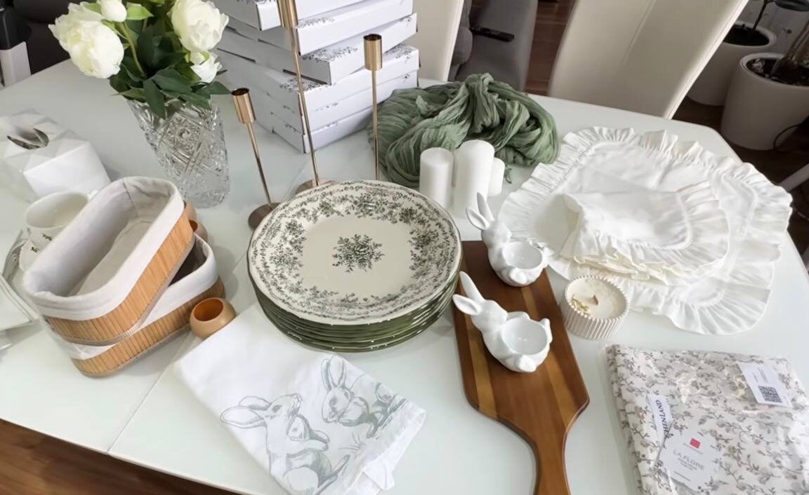 🤗! 🌷Итак: 1. Дорожка зеленая на стол 2. Салфетки льняные с рюшами 3. Салфетки белые прямоугольные 4. Подсвечники золотые 5. Свечи белые набор 6. Подставка для яйца зайчик 7. Фартук 8. Тарелка зеленые узоры 9. Пионы искусственные 10. Корзинки- органайзеры плетеные Девочки, многого , возможно, уже нет в наличии на маркетплейсах. Смотрите в «похожих» - наверняка есть у других продавцов🤗🌷