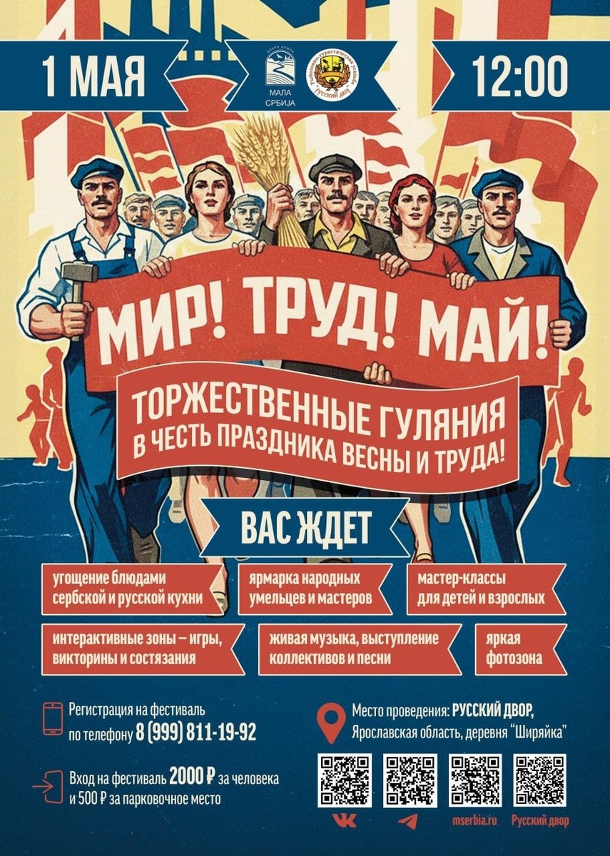 ! 🌸 Друзья, всем привет! Нам очень приятны все ваши реакции, и мы рады, что вы нас не забыли ❤️ Сегодня мы хотим поделиться с вами новостью о празднике, которого мы так долго ждали. Ждали и мы, и вы! 🌷 1 Мая — День весны, мира и труда! В этом году мы готовим для вас нечто особенное — большой праздник в коллаборации с Русским Двором! 🎉 📍 Где? В Русском Дворе 📅 Когда? 1 Мая! Что вас ждёт? ✨ Советская атмосфера: окунёмся в ностальгию, примем в пионеры самых юных гостей и вспомним историю этого замечательного дня. 🎶 Живая музыка: зарядимся отличным настроением под любимые мелодии. 💃 Танцевальные коллективы: яркие выступления не дадут вам скучать ни минуты! 🍲 Ароматные кухни сербская и русская : самые вкусные угощения ждут вас! 📞 Регистрация по телефону:89998111992 Важно!Для проживающих гостей в Малой Сербии или Русского двора — вход бесплатный! Не упустите возможность провести этот день в тёплой компании, с музыкой, танцами и вкусной едой. Ждём именно вас! ❤️ #1мая