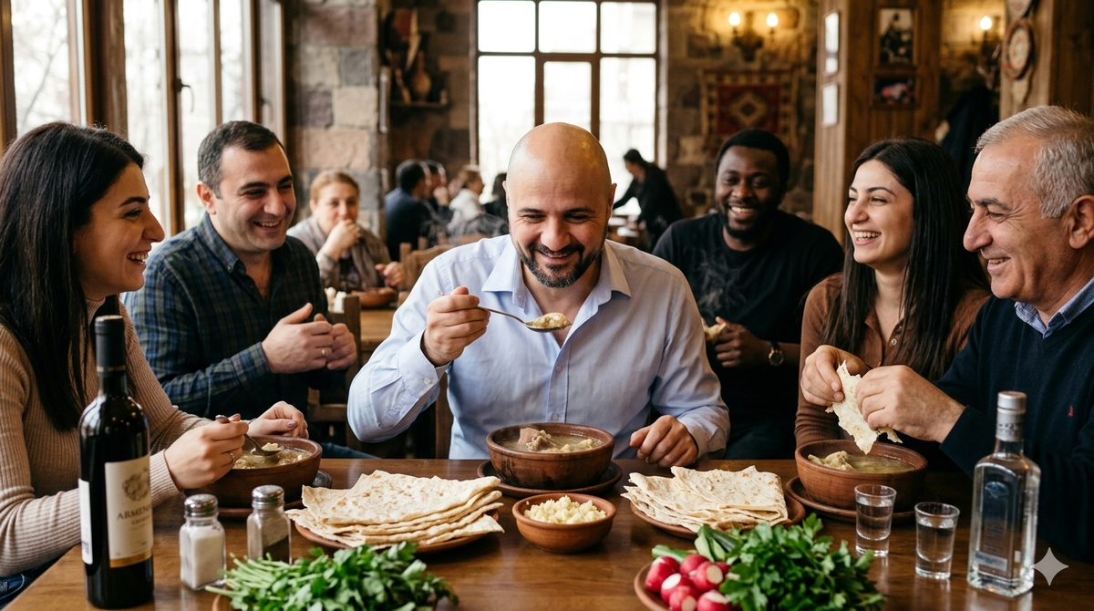 На столе всегда одно и то же: глубокие миски с белым дымящимся бульоном, стопки лаваша, редиска, Джермук — армянская минералка — и водка. Водка обязательна. Это не алкоголизм — это химия. Жирный коллагеновый бульон требует чего-то что его разрежет. Водка справляется идеально.