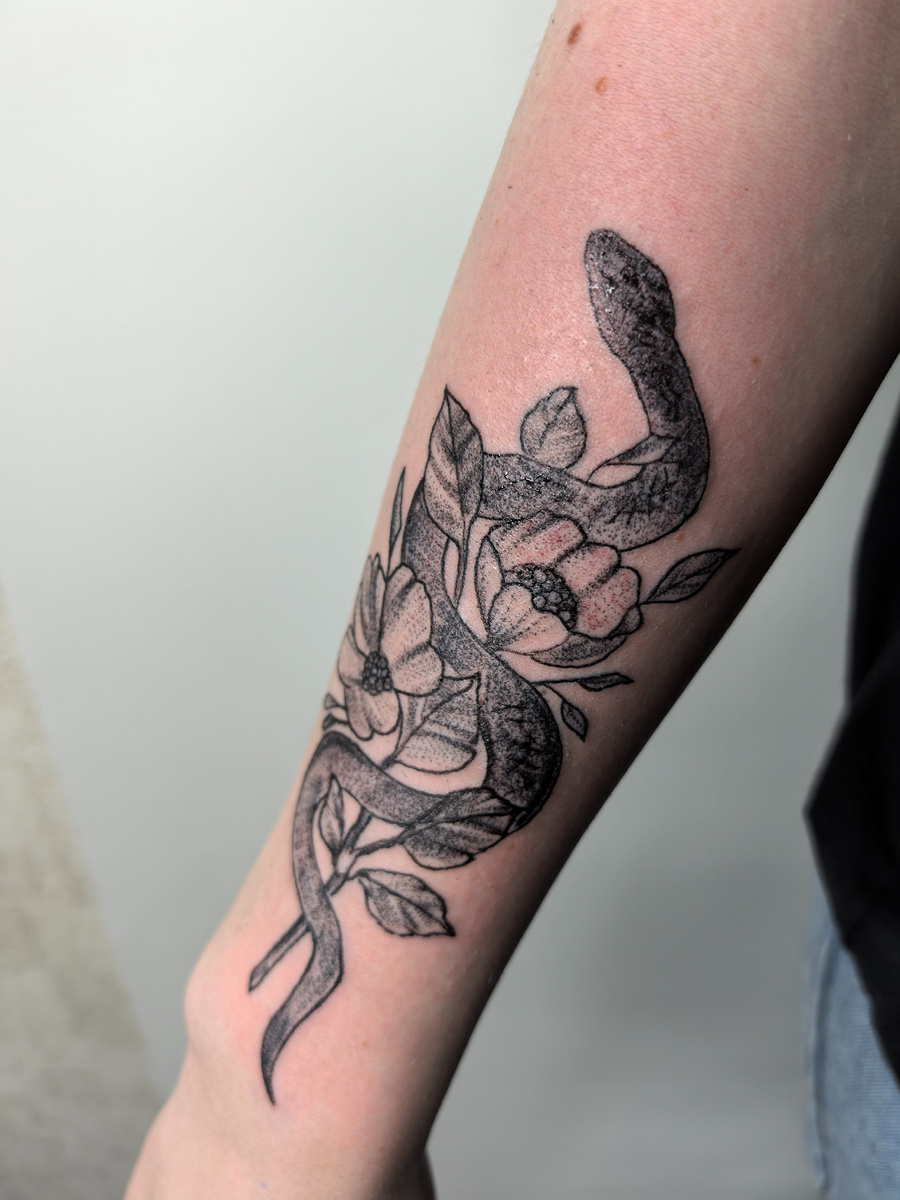 Татуировка, змея с цветами — это один из наиболее символичных и многогранных дизайнов в искусстве боди-арта .