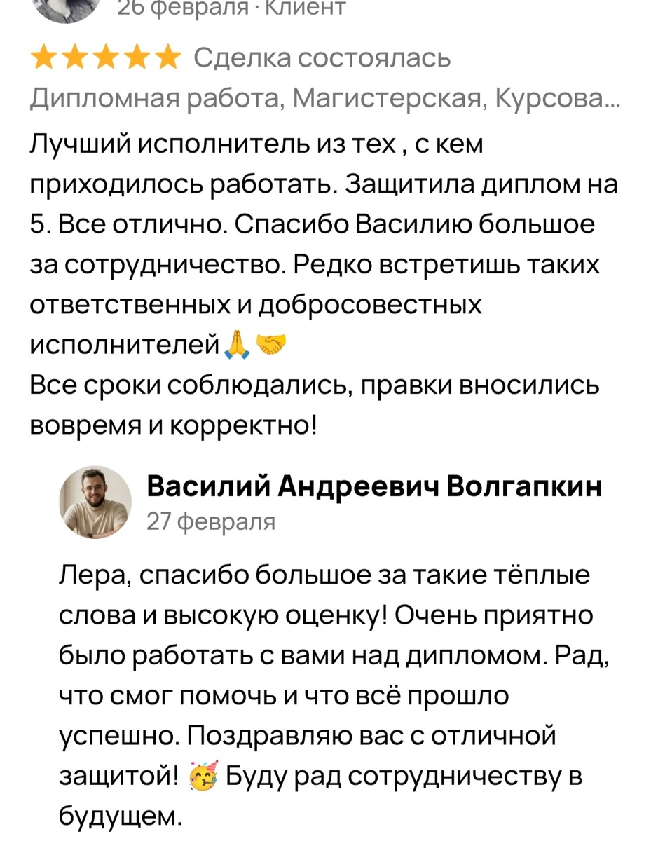 Особенно, когда клиенту действительно есть, с чем сравнивать. Писали со студенткой дипломную работу. Стандартные требования, сроки не горят, научный руководитель - вполне заурядный. Можем, вам и скучно читать, а я таким кейсам радуюсь как ребёнок - в моей работе редко когда бывают спокойные и размеренные заказы. Обговорили все условия, приступили к работе. В процессе написания: Итог работы - защита на отлично! 🔥 И такой вот комплиментарный отзыв от клиентки. Нужен диплом на пять от лучшего исполнителя? Обращайтесь. НАПИСАТЬ МНЕ В ВК или написать в Telegram @volgapkinStud МОЙ КАНАЛ В TELEGRAM СООБЩЕСТВО В ВК ОТЗЫВЫ О МОЕЙ РАБОТЕ