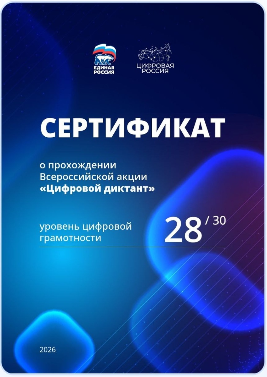 ? С 7️⃣ по 1️⃣4️⃣апреля 2026 года партийный проект «Цифровая Россия» запускает уникальную возможность – пройти всероссийский Цифровой диктант. В течение недели любой совершеннолетний гражданин России может бесплатно проверить свои знания и навыки в области цифровой грамотности с помощью онлайн-теста. После прохождения теста вы получите персональный электронный сертификат с подробными результатами и объяснениями к каждому заданию. Цифровой диктант - это самая масштабная в России акция по проверке цифровой грамотности. Ссылка на тест 👇 https://digital.er.ru/ #ЕдинаяРоссия #ЕР23 #ЦифровойДиктант