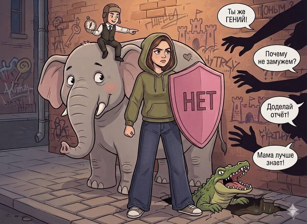 Рептилия (сегодня в костюме Аллигатора): Ваша инстинктивная защита. Он живет глубоко в иле и просыпается только тогда, когда Всадник и Слон не справляются. Его метод — резкий укус (тот самый мат или крик), после которого остается горькое послевкусие.