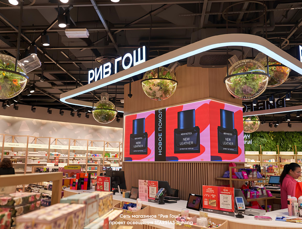 Освещение в магазине косметики — это не просто техническая часть проекта. Это инструмент, который напрямую влияет на восприятие пространства, навигацию, презентацию товаров и комфорт покупателей. В кейсе магазина РИВ ГОШ основной задачей стало создание современного, функционального и визуально привлекательного освещения, которое усиливает интерьер и помогает грамотно раскрыть ассортимент. Магазины косметики предъявляют к свету особенно высокие требования. Здесь важно, чтобы освещение: Свет в таком формате должен работать сразу в нескольких направлениях: как функциональное, акцентное и декоративное освещение. При разработке концепции освещения важно было решить несколько задач одновременно: Для ритейла особенно важно, чтобы свет не был «плоским». Он должен вести покупателя по пространству, помогать ориентироваться и фокусировать внимание на товарах. В проекте использован многослойный подход к освещению, где каждая группа светильников решает свою задачу. Для подсветки ключевых зон и това