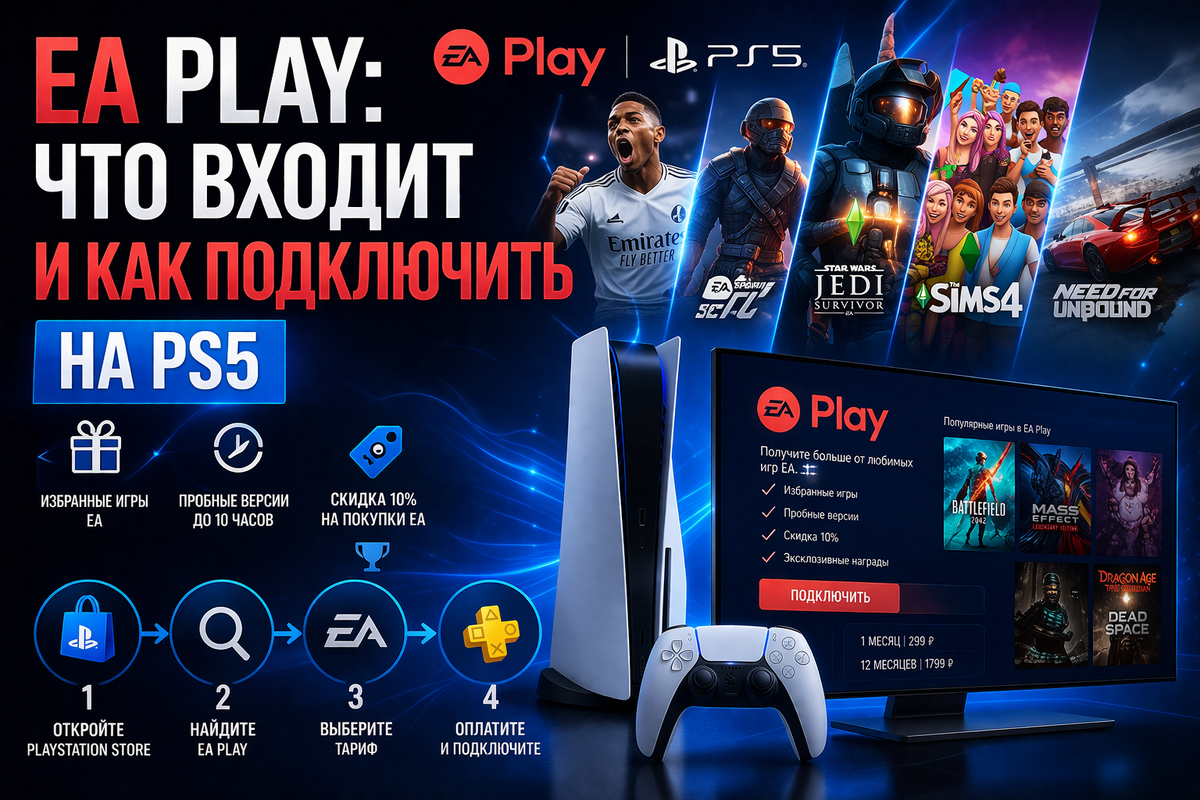 Кратко: EA Play — отдельная подписка на 80-100 игр Electronic Arts. FC 25, Battlefield, Mass Effect, Dead Space, Star Wars, Need for Speed. Цены — от 600₽/мес (Индия). Не входит в PS Plus — покупается отдельно. Что такое EA Play EA Play — подписка от Electronic Arts с доступом к библиотеке их игр. Работает на PS5, PS4, Xbox и ПК. Даёт три вещи: • Библиотека из 80-100 игр для скачивания • Скидка 10% на все покупки EA в PS Store (игры, DLC, внутриигровые покупки) • Ранний доступ к новинкам EA — 10 часов до покупки Какие игры есть Полный каталог обновляется, но вот основные на апрель 2026: Спорт: • EA Sports FC 25 (предыдущая часть, FC 26 появится позже) • Madden NFL 25 • NHL 25 • UFC 5 • PGA Tour Шутеры и экшен: • Battlefield 2042, Battlefield V, Battlefield 1 • Star Wars Battlefront II • Star Wars Jedi: Fallen Order • Star Wars Jedi: Survivor • Dead Space (ремейк) • Titanfall 2 Гонки: • Need for Speed Unbound • Need for Speed Heat • Burnout Paradise Remastered RPG и приключения: • Mass