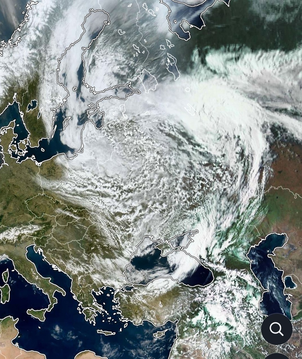 На спутниковом снимке - огромный облачный вихрь бывшего циклона «Рапунцель», виновника нашей непогоды, фронт которого сейчас проходит над нами.