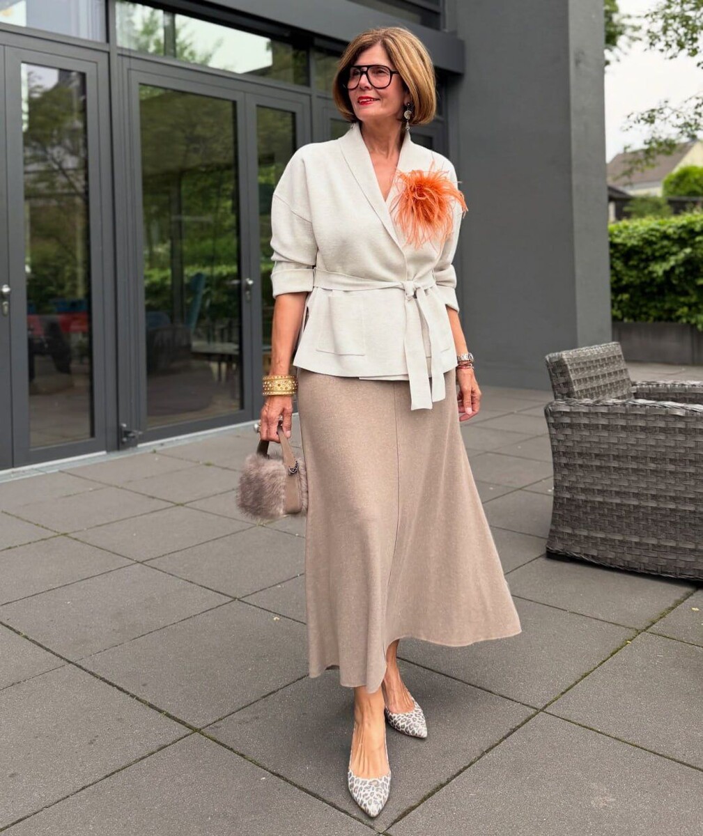 Наверняка, в гардеробе каждой женщины можно найти хотя бы одну юбку. Кто-то носит такие вещи постоянно и считает их самыми женственными и элегантными, а кто-то надевает лишь от случая к случаю, но в любом случае юбка является самым простым способом создания эффектного, нарядно-праздничного и стильного образа. А с наступлением весны именно юбки позволят дамам выглядеть привлекательно и свежо. 1. Свободная бежевая юбка-трапеция длины макси в сочетании с кремово-белым кардиганом без застежки, с поясом, и с «леопардовыми» туфлями в светлых тонах – нежный и женственный наряд, контрастной ноткой которого можно сделать оранжево-коричневое украшение на груди. С одной стороны, сдержанный, с другой – очень эффектный, такой ансамбль красиво обрисовывает фигуру своей владелицы и «подсвечивает» нежный тон ее кожи. 2. Серо-белая расклешенная юбка длиной до щиколоток смотрится по-настоящему элегантно и даже изысканно, но она вполне может использоваться для создания не только торжественных образов, но