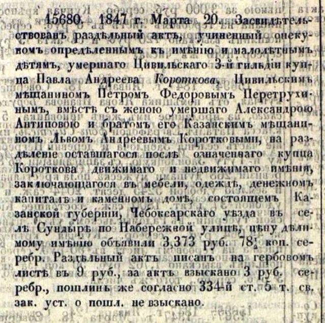 Сенатские объявления по казенным, правительственным и судебным делам 1847 г. № 37. Стр. 35 скан. 15680, 1847 г. Марта 20. Засвидетельствован раздельный акт, учиненный опекуном определенным к имению и малолетним детям умершего Цивильского 3-й гильдии купца Павла Андреева Короткова, Цивильским мещанином Петром Федоровым Перетрухиным, вместе с женою умершего Александрою Антиповою и братом его Казанским мещанином Львом Андреевым Коротковыми, на разделение оставшегося после означенного купца Короткова движимого и недвижимого имения, заключающегося в мебели, одежде, денежном капитале и каменном доме, состоящем Казанской губернии, Чебоксарского уезда в селе Сундыре по Набережной улице, цену делимому имению объявили 3,373 рублей 78 копеек серебром. Раздельный акт писан на гербовом листе в 9 рублях, за акт взыскано 3 рубля серебром, пошлин же согласно 334-й статьи 5 тома Свода законов Устава о пошлинах не взыскано. https://yandex.ru/archive/catalog/da6408b2-6a16-48a6-86b6-f6fb85167bc7/35