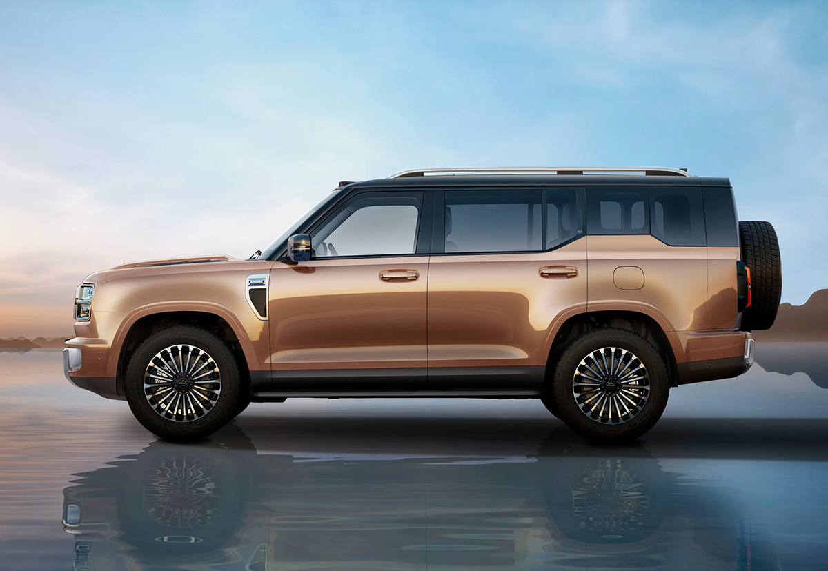 Профиль кроссовера отличается ровной линией крыши, массивными колесными арками, в которые вписаны крупные многолучевые хромированные диски, и традиционными дверными ручками без выдвижных механизмов. Корма представляет собой практически вертикальную плоскость с распашной дверью багажника, на которой закреплено полноразмерное запасное колесо, подчеркивающее серьезный внедорожный характер автомобиля. В облике новинки угадываются черты многих рамных внедорожников, но при этом Haval HX не имеет классической рамной конструкции, используя более современную и комфортную для повседневной езды несущую схему кузова.
