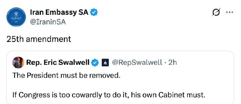 IRANIAN EMBASSY IN SOUTH AFRICA calls for using the 25TH AMENDMENT AGAINST TRUMP