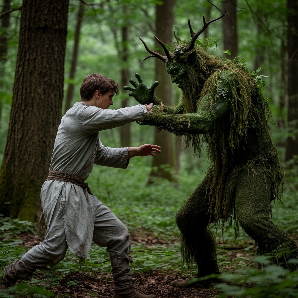 Вдруг деревья зашевелились, словно ожили. Затем прямо у подножия могучего дуба вздыбились корни, которые в считанные секунды сложились в высоченную, нескладную, человекоподобную фигуру. Тело быстро покрылось бледно-зелёной осиновой корой, словно кожей, а в узких глазах-провалах зажёгся свет. Фигура растопырила ноги-корни и руки-ветви, после чего проревела голосом, похожим на скрип сухого дерева: