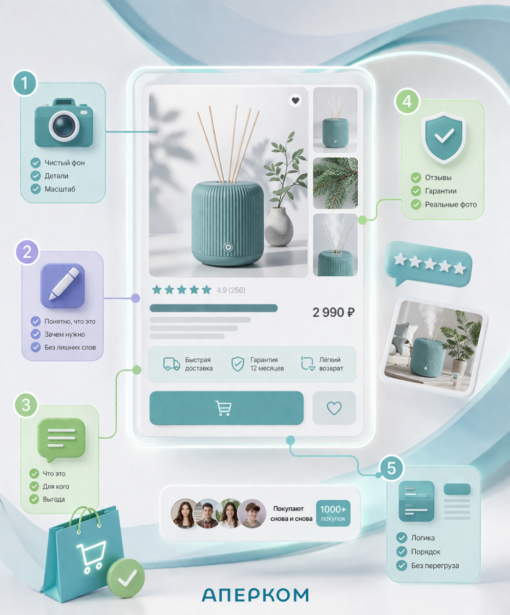 доверие создаётся не количеством, а реалистичностью. Лучше 5 живых отзывов, чем 50 «идеальных». Карточка должна читаться за 5–7 секунд. Если человек не понял: