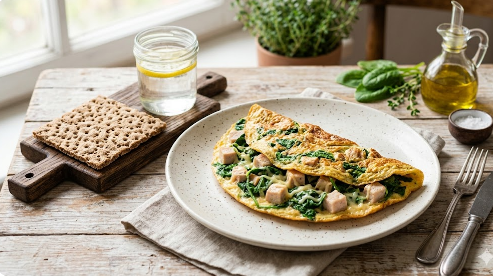 Блюдо: Сытный омлет со шпинатом и индейкой + тост без муки