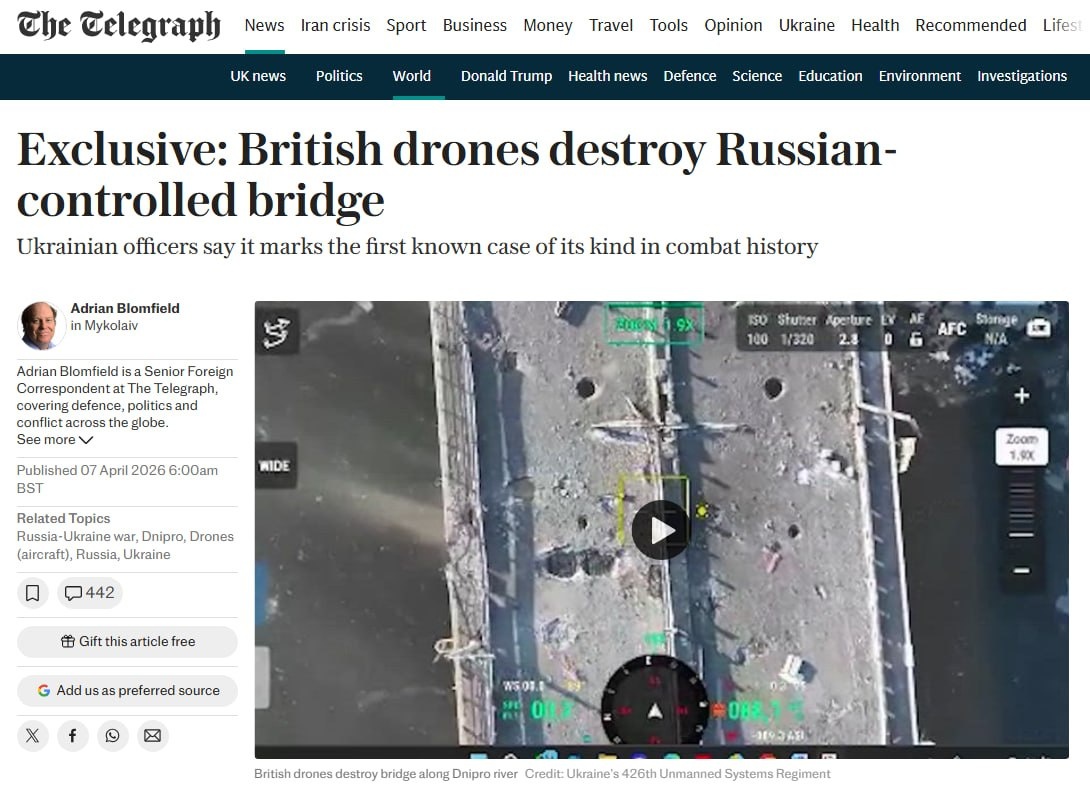 The Telegraph признает, что в марте при ударе по якобы ключевому мосту на реке Конка в Херсонской области были использованы британские БПЛА Malloy T-150. Это даже называют «операцией, которая определит будущее военного искусства». «Такие операции дают западным оборонным компаниям бесценную возможность проверить свою технику в реальных условиях», — сообщает газета. Пусть не жалуются, если какое-нибудь новое оружие «проверят» на британской инфраструктуре. 👍«БайБайден» в МАХ