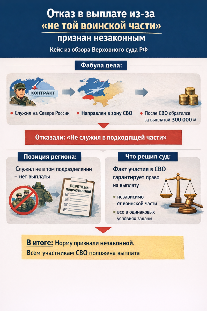 Ещё один показательный случай из обзора Верховного суда РФ: регион отказал участнику СВО в выплате только потому, что он служил не в подразделении, которое регион посчитал «подходящим».