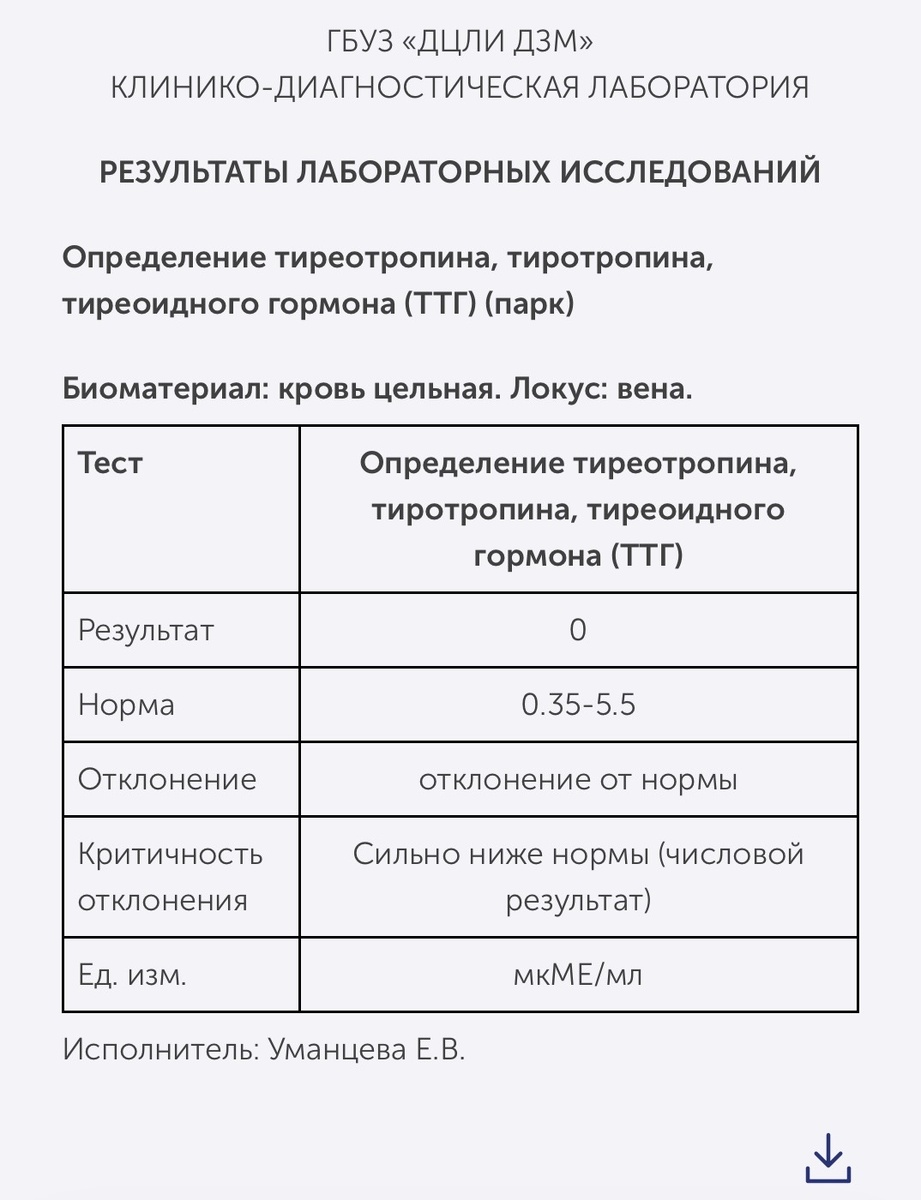 К эндокринологу я попала по чистой случайности, проходя диспансеризацию. Врач решила посмотреть узлы на шее. В первом анализе уровень ТТГ (тиреотропного гормона) оказался 0 при норме 0,35–5,5. А анализ на исследование антител к рецептору ТТГ показал 11,93 при норме 0,3–1,75. Т3 и Т4 были в норме. Щитовидная железа не увеличена.