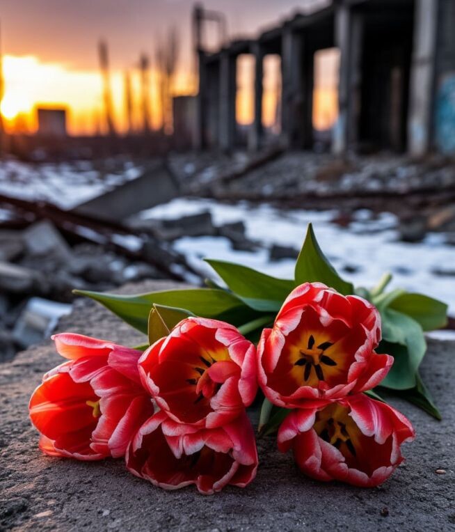 В центре — букет нежных тюльпанов. Алые, с белыми краями, они казались невозможными в этом мире льда. Кто‑то принёс их издалека — сквозь метель, мимо минных полей, рискуя жизнью.