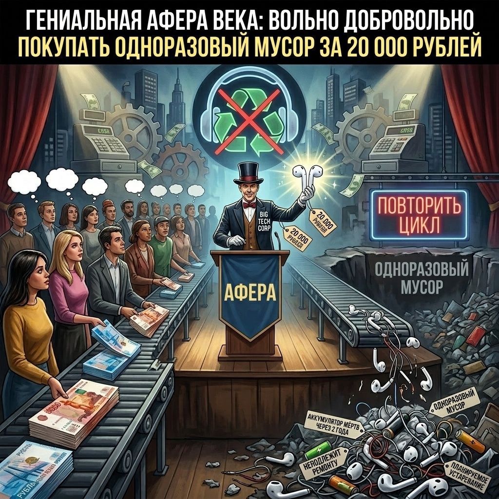 Вспомните тот день, когда производители смартфонов торжественно убрали разъем для обычных наушников. Нам сказали: «Провода — это прошлое! Будущее за свободой!». И понеслось. Сегодня люди бездумно отдают по 20–30 тысяч рублей за AirPods Pro, Galaxy Buds или Sony. Мы восхищаемся магией быстрого подключения и шумоподавлением. Но корпорации скромно умалчивают о том, что нам продают не гаджет, а самую настоящую подписку на электронный мусор. Давайте разберем три жестких факта, почему покупка TWS-наушников — это самая невыгодная сделка в вашей жизни. Любые проводные наушники за 3000 рублей от Sennheiser или JBL могут прослужить вам 5, 7, а то и 10 лет, пока вы физически не порвете кабель. С беспроводными «затычками» этот номер не пройдет. В каждом микроскопическом наушнике стоит крошечный литий-ионный аккумулятор, который деградирует с каждым циклом заряда. Физику не обмануть: ровно через 2–2,5 года ваши дорогие AirPods начнут разряжаться за 40 минут на морозе, а один наушник станет садитьс