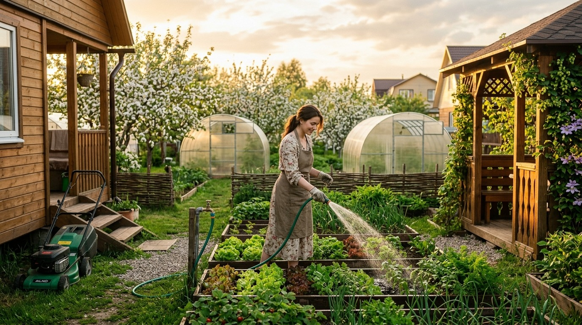 Мы с Алексеем приехали туда в первый раз в мае. И я замерла. Не от красоты. От запустения. Трава по пояс, крыльцо просело, внутри пахло сыростью и мышами. Газонокосилки не было – сгорела ещё при отце. Насос для полива – ржавое ведро с дырявым шлангом.