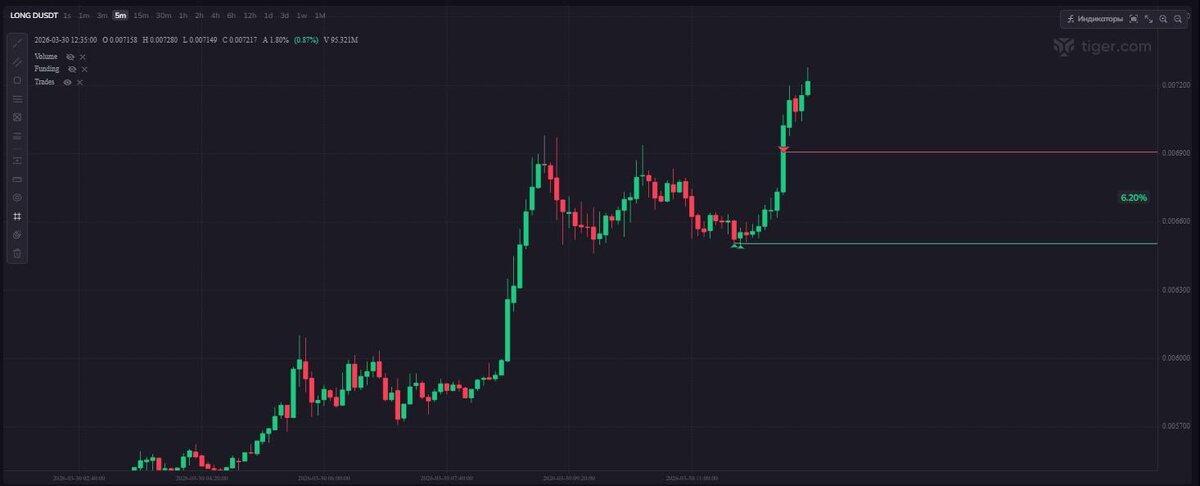 - Монета должна пампится (15% и выше роста за последние 5 минут)