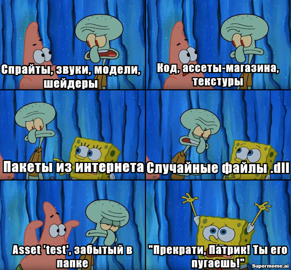 Описание мема: кадр из «Спанч Боба», где Патрик тычет в перечень хаоса: спрайты, звуки, модели, шейдеры, код, ассеты из магазина, текстуры, случайные .dll, папки test, test_2, test_КОНЕЧНАЯ. Подпись: «Прекрати, Патрик! Ты его пугаешь!»