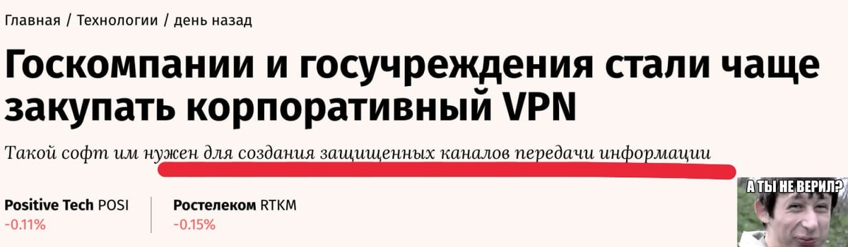 ? В I квартале 2026 года число госзакупок корпоративных VPN по 44-ФЗ и 223-ФЗ выросло на 22,6% год к году и достигло 1016 процедур. При этом общий объём рынка резко сократился: сумма закупок снизилась с 6,9 млрд до 2,02 млрд рублей, а средняя начальная максимальная цена контракта упала на 76,2% — до 1,98 млн рублей. Эксперты связывают это с тем, что годом ранее VPN чаще закупали в составе крупных инфраструктурных проектов, а теперь такие решения всё чаще оформляют как отдельные закупки. Да, корпоративный VPN остаётся базовым инструментом защиты данных при передаче по открытым каналам связи и используется для безопасного доступа сотрудников к внутренним сетям компаний, но, кто понял — тот понял. Для тех, кто не понял: отрицательно одарённые путинские халдеи сначала на наши с вами деньги блокируют интернет, а потом на наши же с вами деньги покупают себе VPN, чтобы выходить в заблокированный интернет, который сами же и заблокировали.