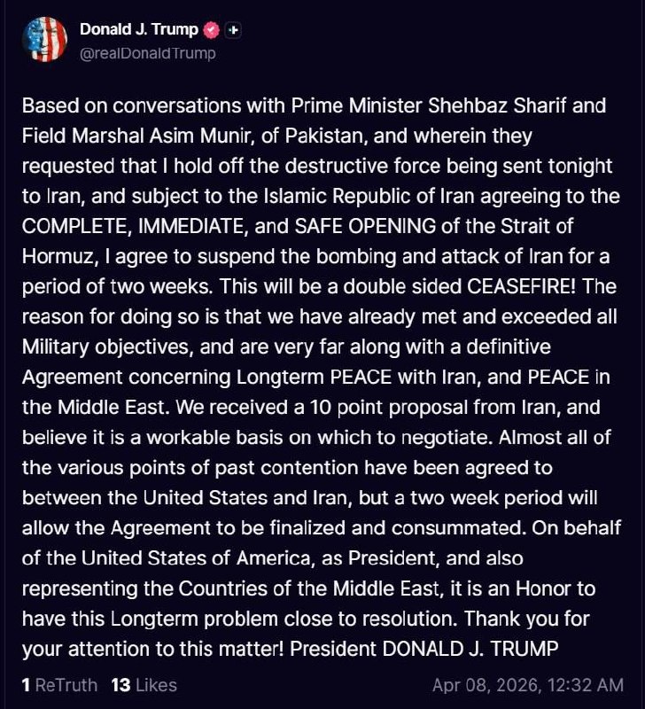 TRUMP SUSPENDS IRAN BOMBING FOR 2 WEEKS