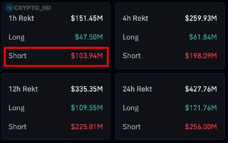 🫡 Сoinglass: За 1 час ликвидировано SHORT-позиций на $103,000,000